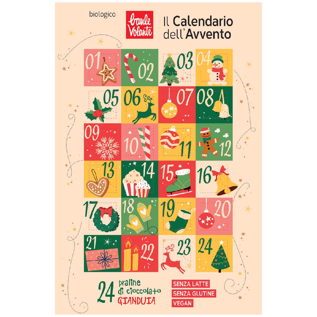 Il Calendario dell’Avvento di Baule Volante è una coccola quotidiana per il palato, con praline biologiche dal cuore di gianduia, pensate per chi ama prendersi cura di sé senza rinunciare al gusto.
