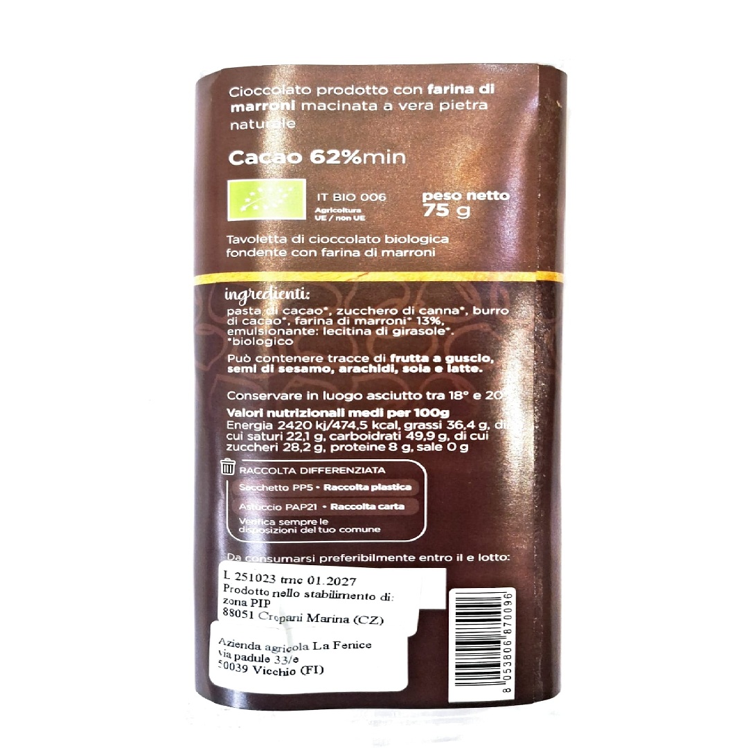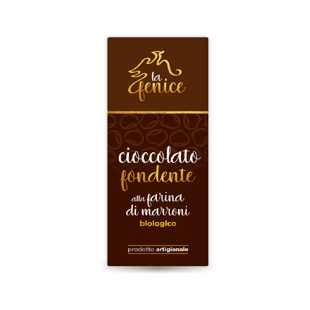 Cioccolato Fondente alla farina di marroni di La Fenice è in confezione da 75 g.