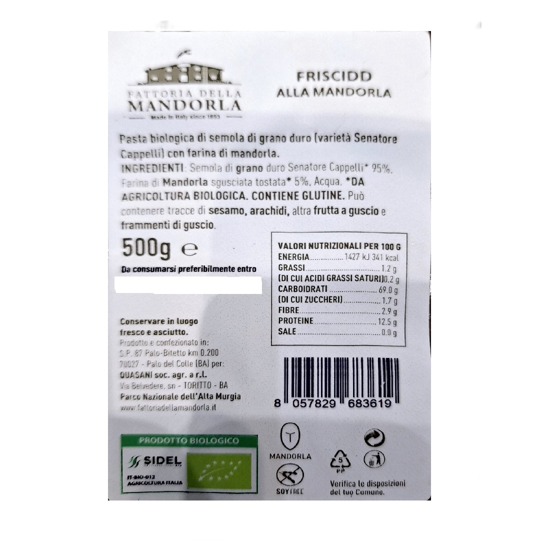 Friscidd alla Mandorla della Fattoria della Mandorla è in confezione da 500 g.