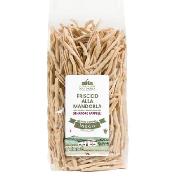 Friscidd alla Mandorla bio della Fattoria della Mandorla – pasta artigianale pugliese di semola di grano duro 100% biologico con mandorle sgusciate bio, dal gusto delicato e aromatico.