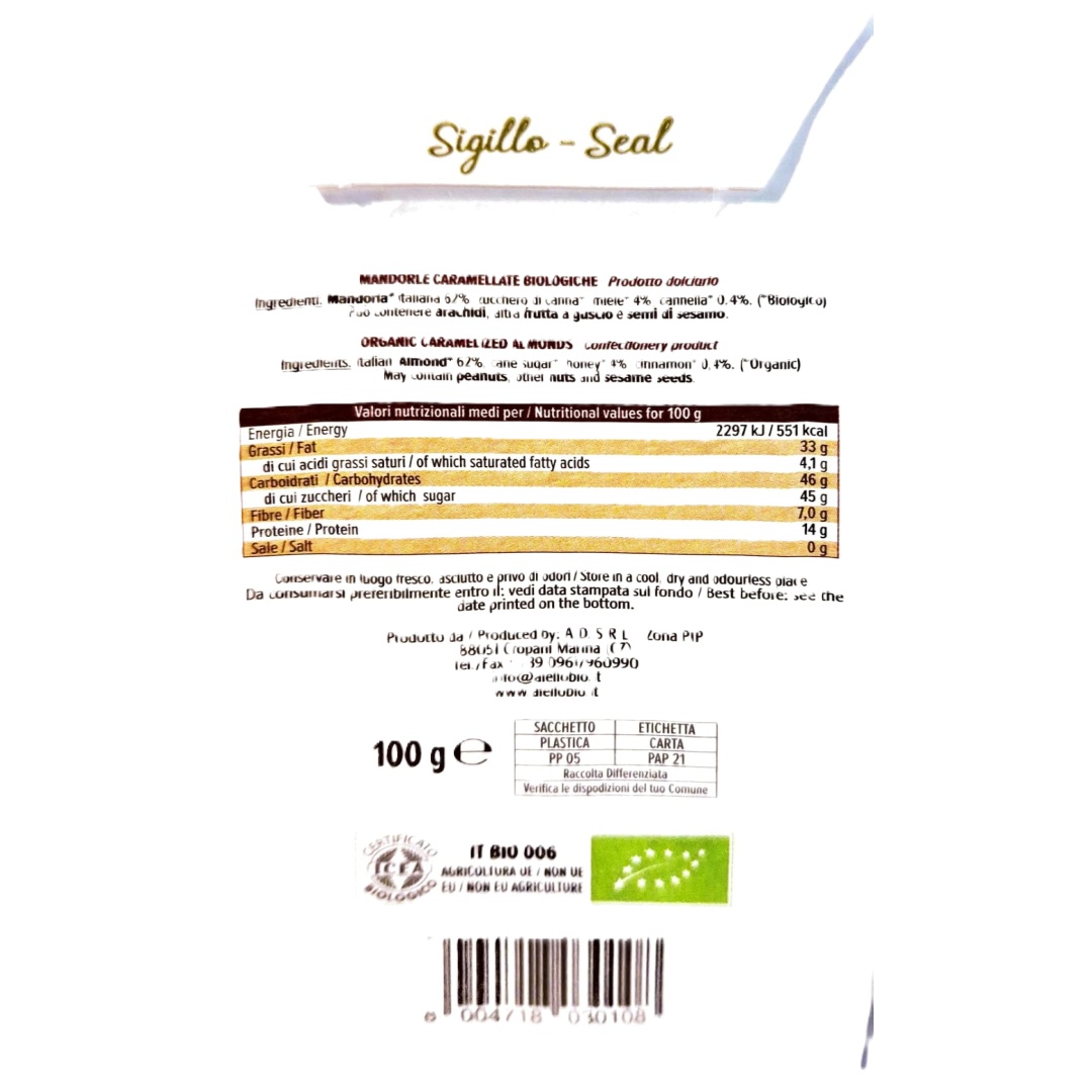 Le Mandorle Caramellate con miele e cannella Io&Bio sono in confezione da 100g.