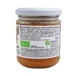 *peperoni 26%, *olio di semi di girasole, , *ricotta 10% (*siero del LATTE), *ANACARDI, *cipolla, *polpa di pomodoro, *pomodori secchi, *doppio concentrato di pomodoro, *formaggio PECORINO 3,2%, *succo di limone, sale marino, *basilico, *origano. *biologico.