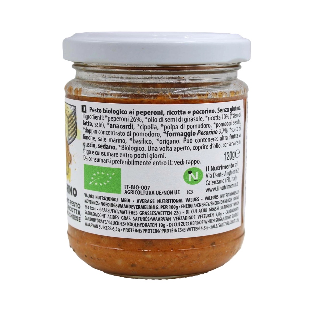 Il Pesto Peperoni Ricotta e Pecorino di Il Nutrimento è in barattolo di vetro in confezione da 120 g.