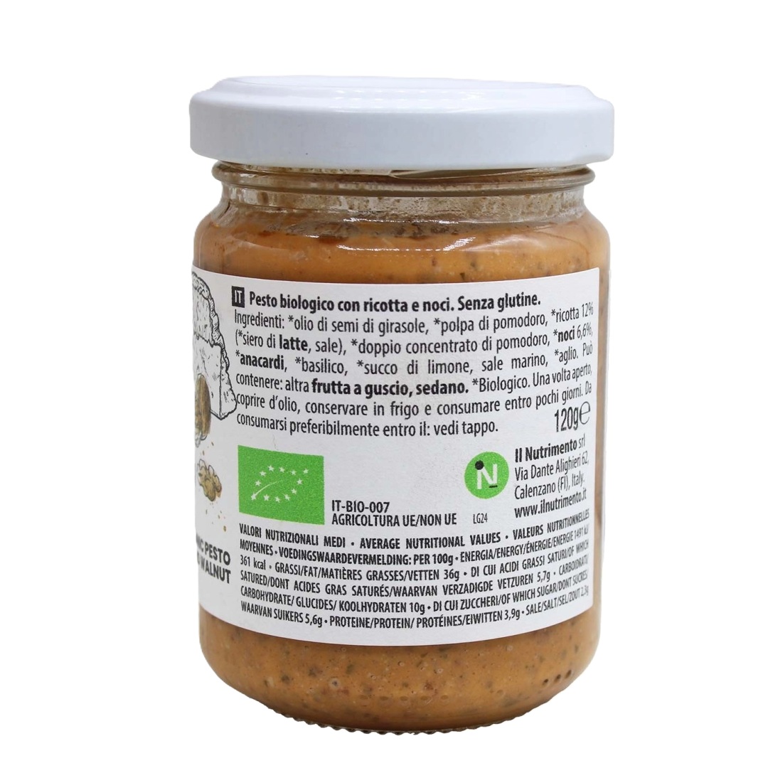 *olio di semi di girasole,*polpa di pomodoro, *ricotta 12% (*siero di LATTE, sale), *doppio concentrato di pomodoro *NOCI 6,6%, *ANACARDI, *basilico *succo di limone, sale marino, *aglio. *biologico.