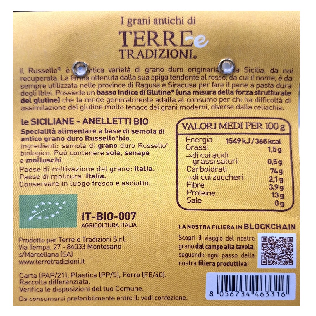 Anelletti Bio di Grano Duro Russello di Terre e Tradizioni è in confezione da 400 g.