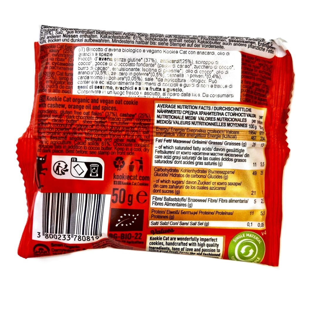 Fiocchi d’avena senza glutine* (37%), anacardi* (25%), sciroppo di cocco*, gocce di cioccolato fondente* (massa di cacao*, zucchero di cocco*, burro di cacao*, emulsionante: lecitina di girasole*), olio di cocco*, olio di arancia* (0,5%), zenzero in polvere* (0,5%), cannella in polvere* (0,4%), cardamomo in polvere* (0,05%), sale. *da agricoltura biologica.