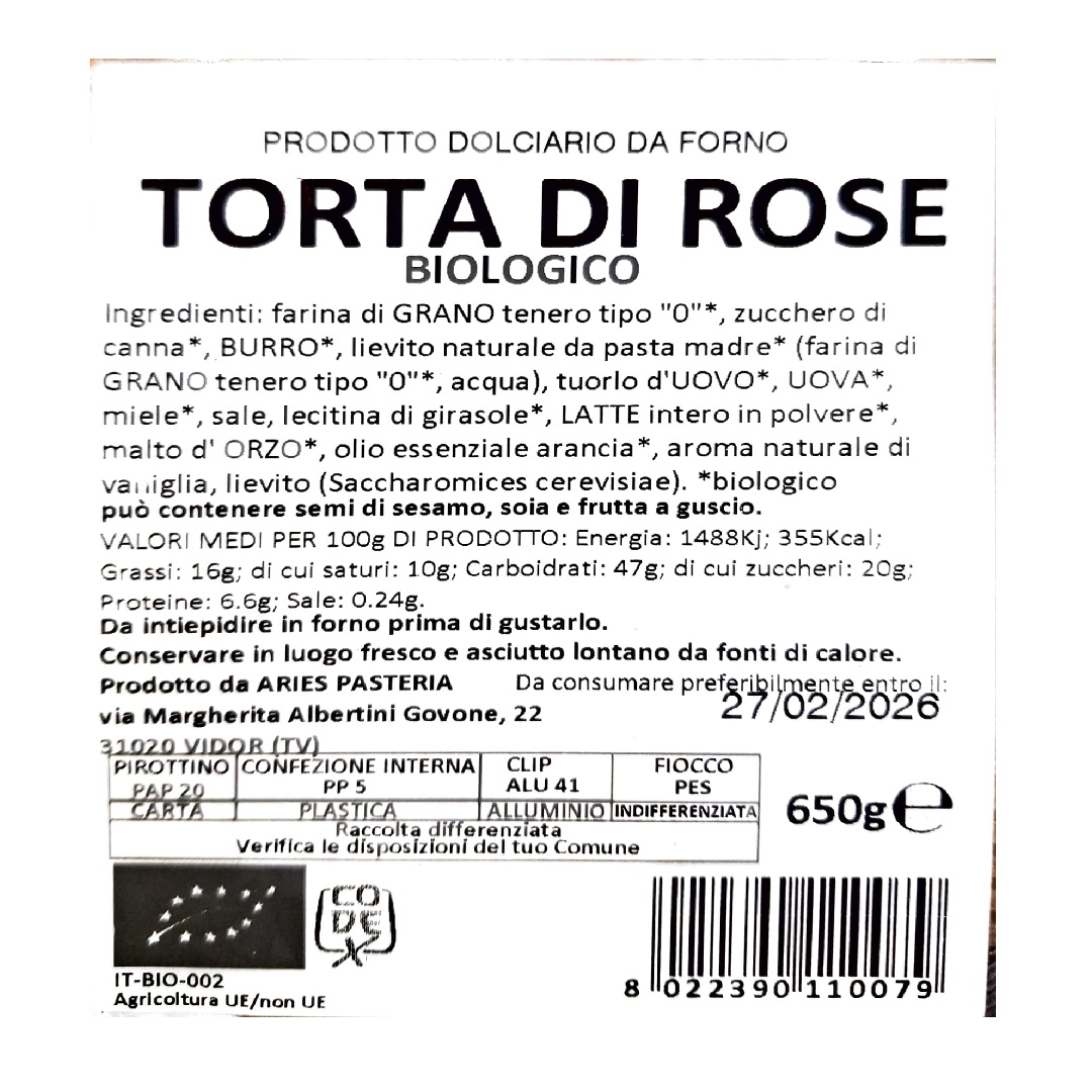 Farina di GRANO tenero tipo “O”*, zucchero di canna*, BURRO*, lievito naturale da pasta madre* (farina di GRANO tenero tipo “0”*, acqua), tuorlo d’UOVO*, UOVA*, miele*, sale, lecitina di girasole*, LATTE intero in polvere*, malto d’ORZO*, olio essenziale arancia*, aroma naturale di vaniglia, lievito (Saccharomices cerevisiae). *prodotto biologico