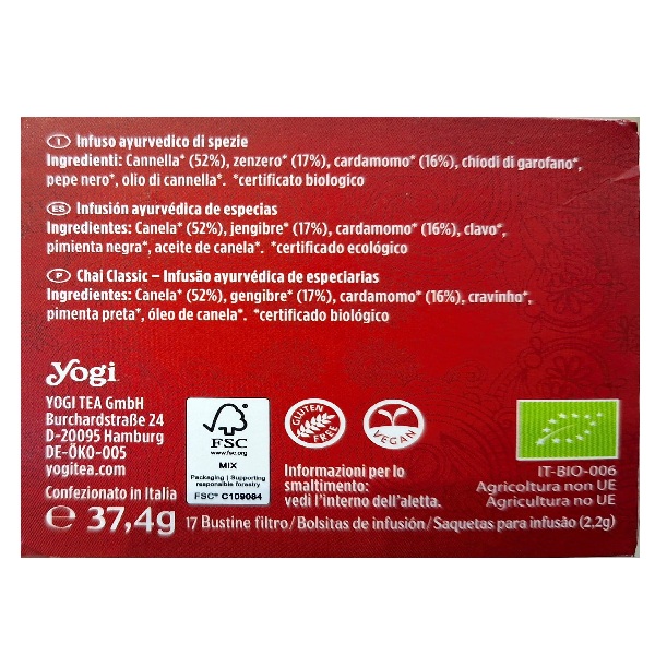 L’Infuso Chai Classic di Yogi Tea è in confezione da 17 filtri per un totale di 37,4 g.
